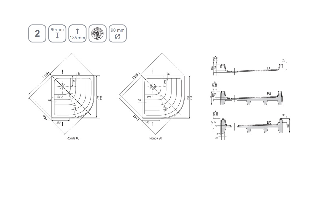 Возможна установка на ножки или в пол (тип LA), облицовка керамической плиткой (тип EX) или самонесущие поддоны, укрепленные полиуретановым носителем, в этом случае панель и поддон образуют одно целое (тип PU), а носитель обеспечивает легкую установку поддона.