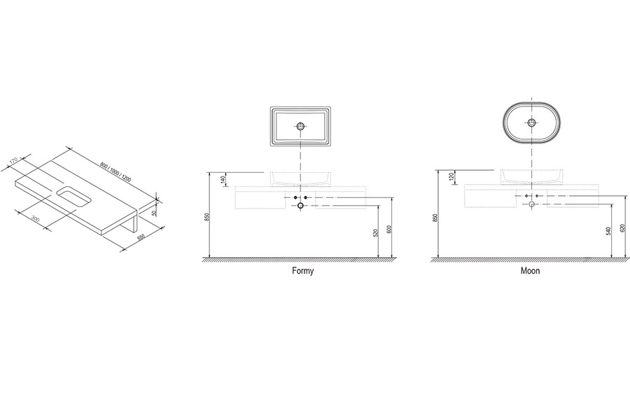 Исключительная по форме столешница, прежде всего, предназначена под умывальники Formy. Имеет специальную пропитку длямаксимальной устойчивости к влажной среде, представленав трех цветах и трех материалах. Столешница предоставляет много свободного места для вещей.