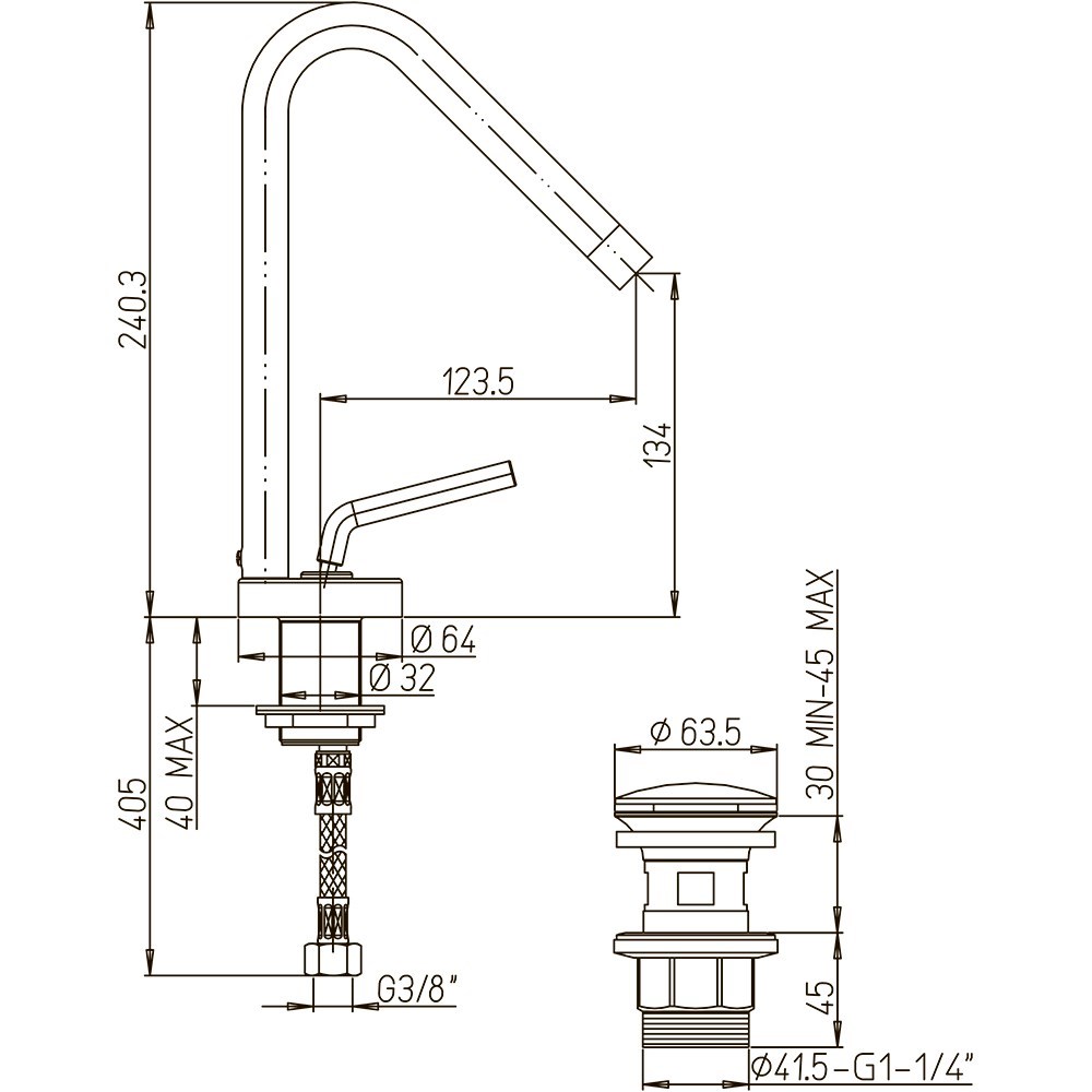 Однорычажный смеситель: 1;Соединительные шланги: 2;Крепежный набор: 1;Инструкция по монтажу: 1;Донный клапан: 1;