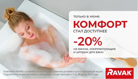 Уважаемые покупатели! Информируем вас, что с 1.06.23 по 30.06.23 компания RAVAK запускает акцию "Комфорт стал доступнее". СКИДКА 20% НА ВСЕ ВАННЫ, КОМПЛЕКТУЮЩИЕ + ШТОРКИ ДЛЯ ВАНН! СКИДКА 20% предоставляется на ванны, опорные конструкции, жесткие рамы, усиленные рамы для ванн Domino Plus, панели боковые, панели передние и крепления к ним, сточные комплекты, шторки для ванн. Успейте купить выгодно!
