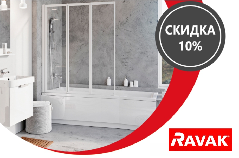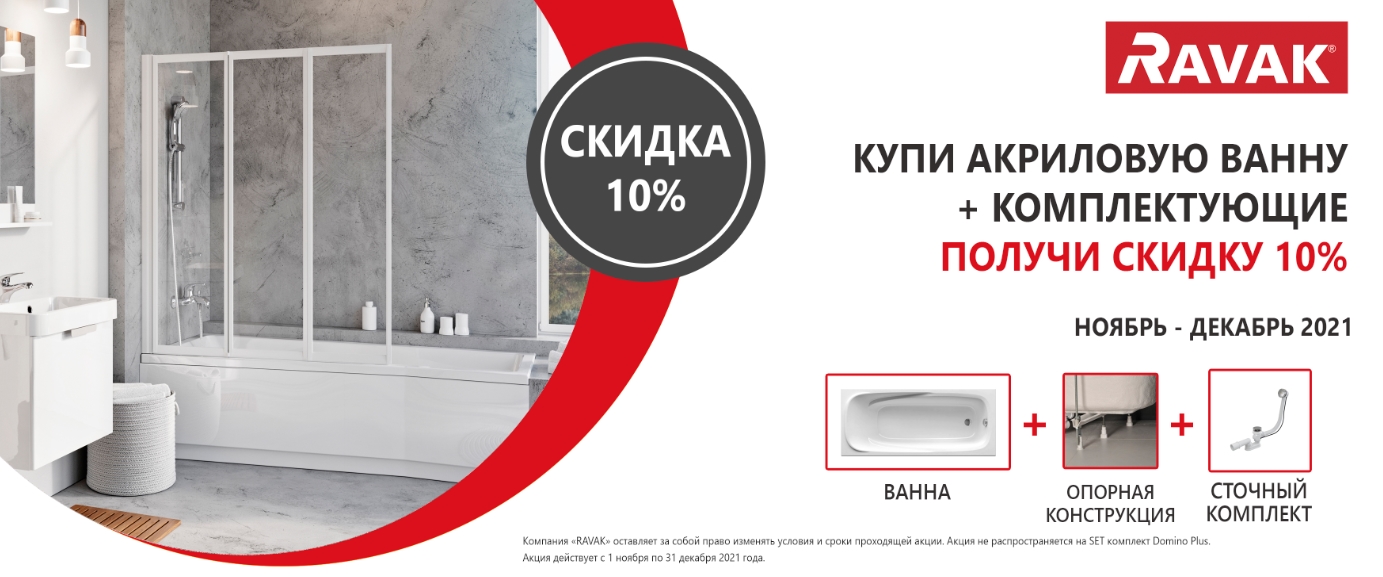 Уважаемые покупатели! с 01 ноября по 31 декабря 2021 года (включительно) вы можете приобрести любую ванну RAVAK, а также комплектующие к ним (опоры, панели, крепления панелей и сточные комплекты) со скидкой 10%. В акции не участвуют: ручки, подголовники, товары по распродаже и SETы.